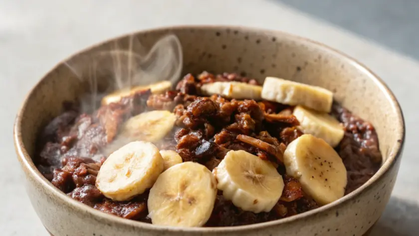 Questa bowl è un piccolo invito a una colazione lenta, da gustare seduti con calma vicino alla finestra. Il colore cioccolato intenso si ammanta di tocchi dorati delle mandorle, mentre il profumo avvolgente di banana e cacao riempie il prato della cucina. Un abbinamento ideale potrebbe essere una tazza di tè verde leggero o un caffè dal aroma delicato, per accompagnare senza sovrastare la morbidezza della bowl. Se vuoi, aggiungi qualche fettina sottile di banana fresca sopra per un effetto fresco e invitante.
