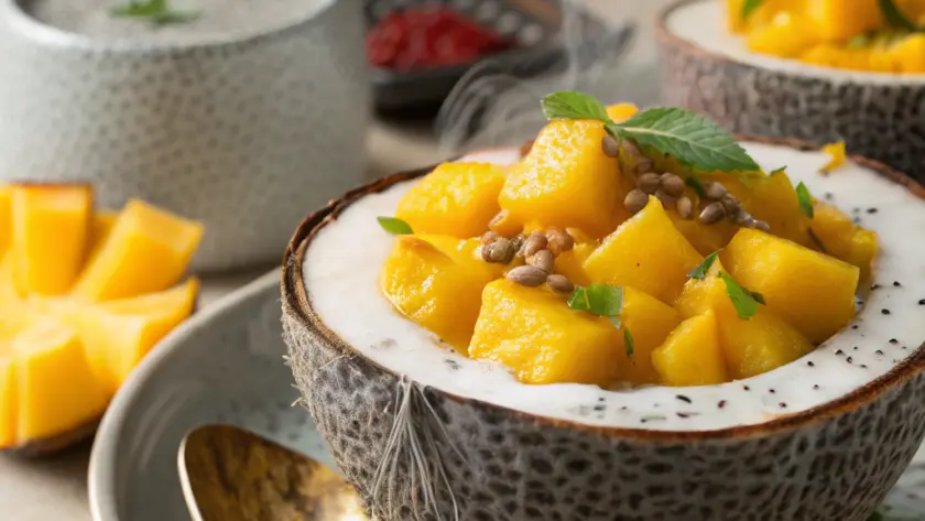 Servi questo chia pudding in coppette di vetro trasparente per mettere in risalto i due colori: il bianco madreperla del cocco e il giallo brillante del mango. Una piccola spruzzata di foglie di menta sulla superficie aggiunge freschezza al profumo e un tocco di eleganza semplice. È un dessert che scivola via leggero, perfetto per una colazione o un fine pasto in cui si vuole restare leggeri ma soddisfatti. Puoi accompagnarlo con una tisana al limone o un tè verde freddo, per esaltare la sensazione di freschezza.