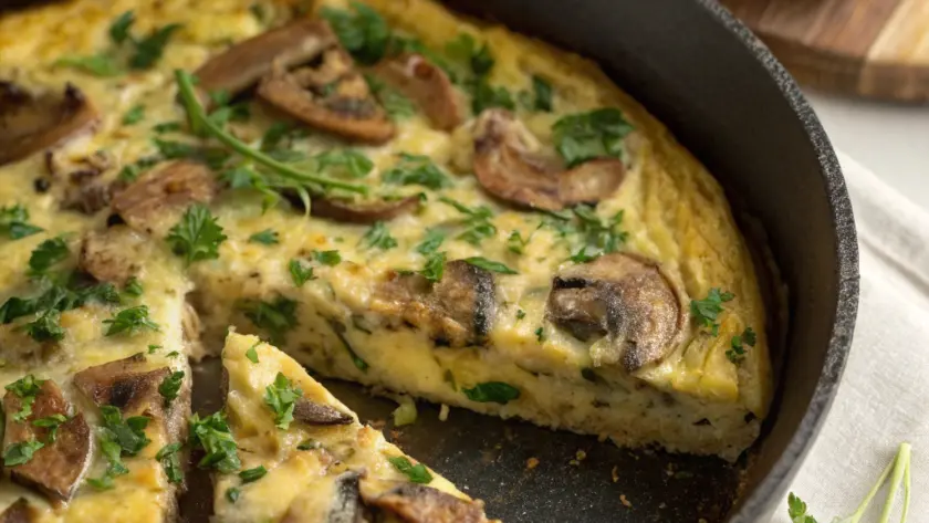 Servi la frittata su un piatto semplice di ceramica bianca per far risaltare il verde brillante del prezzemolo e il beige delicato dei funghi. Accompagnala con una fresca insalata di campo o un contorno di pomodorini tagliati a metà, che aggiungono un contrasto succoso e leggermente acidulo. La semplicità di questo piatto si presta a un pranzo all’aperto o a una colazione salata, lasciando il tavolo aperto a chiacchiere tranquille e al piacere delle cose fatte a mano.