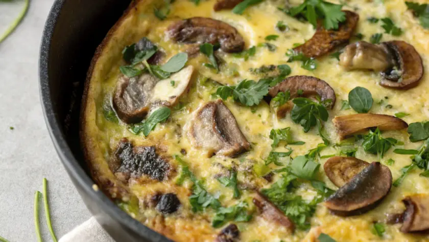 La frittata si presta a essere servita caldo o appena tiepido, accompagnata da una semplice insalata verde o da pomodorini freschi per un contrasto vivido. Il colore chiaro dell’uovo e il verde brillante del prezzemolo si armonizzano con le sfumature terra dei funghi, regalando un piatto che parla di semplicità. Idealmente, portala in tavola su un tagliere rustico, per aggiungere quella sensazione di casa e ospitalità senza fronzoli.
