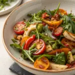 - Prepara la vinaigrette mescolando olio, aceto, miele, un pizzico di sale e pepe fino a ottenere un’emulsione omogenea. Assaggia e regola il dolce e l’acido in base al tuo gusto; il miele dovrebbe smussare l’acidità senza dominare.