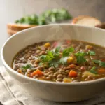 Questa insalata si fa apprezzare per i suoi colori caldi e naturali, con le lenticchie color nocciola, il verde brillante del prezzemolo, e il tenue arancio della carota. Va servita a temperatura ambiente, magari su un piatto ampio e rustico, accompagnata da una fetta di pane casereccio leggermente tostato. È perfetta per un pranzo leggero in giornata ma sa anche funzionare bene come contorno saporito per carni bianche o pesce alla griglia.
