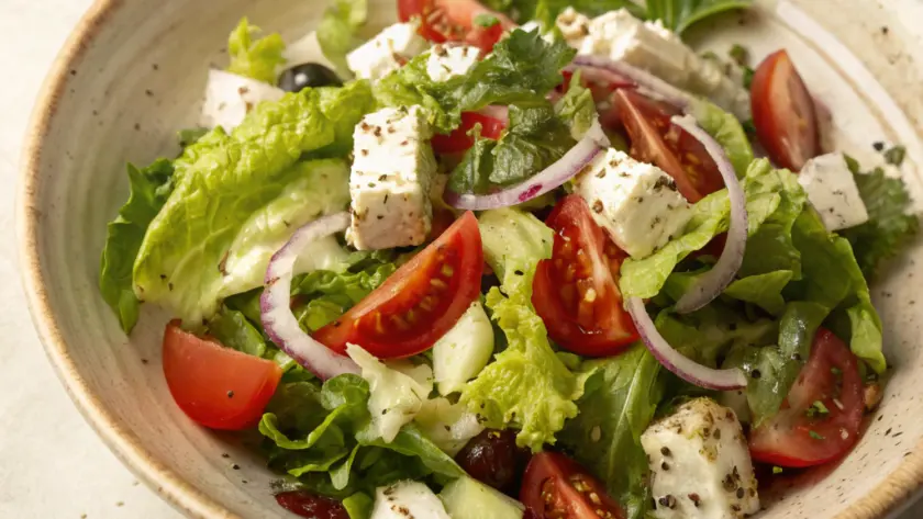 Servi l’insalata in ciotole di ceramica dai colori neutri per far risaltare il rosso vivace dei pomodorini e il bianco della feta sbriciolata. Accompagna con qualche fetta di pane integrale appena tostato, ideale per raccogliere il condimento. L’atmosfera ideale è quella di un pranzo semplice, magari all’aperto o vicino a una finestra aperta, con luci soffuse e una brezza leggera che fa muovere piano le foglie fuori. Un piatto che appare fresco ma che scalda per i ricordi che porta con sé.