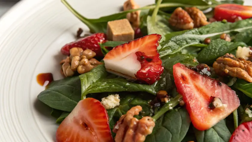 Alla tavola apparecchiata con semplicità, questo mix di colori – il verde intenso degli spinaci, il rosso vivo delle fragole e il dorato delle noci – crea immediatamente una sensazione di freschezza e coinvolgimento. Un piatto che invita a prendersi una pausa, magari accompagnato da un vino bianco leggero o un’acqua frizzante al limone. Si sposa bene con un pane rustico a fette tostate, per aggiungere un’ulteriore nota croccante e rustica. L’insieme continua a raccontare quella primavera in cucina, fatta di gesti semplici e genuini.