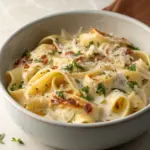 Ricordo ancora il pomeriggio in cui decisi di preparare questa pasta, mentre fuori pioveva leggermente e l’aria era fresca. Il suono dell’acqua contro le finestre accompagnava il leggero ronzio delle pentole. Quando la crema iniziò a prendere consistenza, sprigionò in cucina un aroma caldo, leggermente burroso, che avvolse l’ambiente come un abbraccio silenzioso. Il contatto della salsa con la forchetta poi era una coccola: fluida, vellutata, eppure abbastanza corposa da restare attaccata al pasta, senza scivolare via come una semplice emulsione. È una ricetta di quelle che non richiedono ore e ingredienti complicati, ma che comunque sanno creare un momento intimo e familiare, capace di mettere tutti d’accordo attorno al tavolo. Non si tratta di perfezione, ma di quella semplicità sincera che ti fa sentire a casa, con il cuore più leggero.