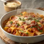 Servi questa pasta in piatti bianchi o terracotta rustici, così da esaltare il colore rosso brillante del sugo. Un filo d’olio fresco prima di portarla in tavola e qualche fogliolina di basilico visibile danno un tocco di naturalezza. Un pane casereccio fragrante o una bruschetta profumata all’aglio sono compagni perfetti per completare il pasto senza appesantire. L’atmosfera ideale è raccolta, con luci soffuse e un bicchiere di vino semplice sul tavolo: la cucina che accoglie dopo una giornata lunga.