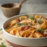 - La scelta della pasta è importante: questa ricetta funziona bene anche con formati corti come i mezzi rigatoni, l’importante è conservare la giusta consistenza al dente.