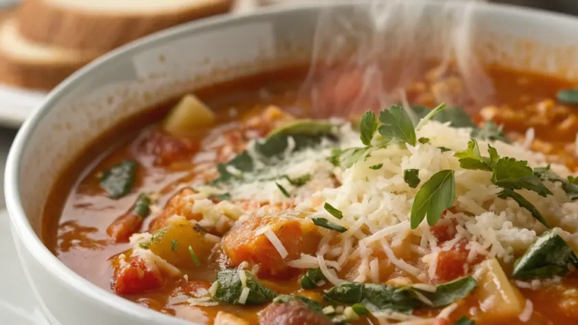 Il minestrone è più invitante se servito in ciotole rustiche, magari di terracotta chiara, che ne esaltano i colori caldi della zucca e del verde delle verdure. Qualche fogliolina di basilico fresco in superficie illumina il piatto e crea un gioco di contrasti naturali. Accompagna con del pane integrale tostato, fragrante, che può essere intinto nel brodo ancora caldo, per un gesto semplice e appagante. L’atmosfera ideale è quella di un pranzo senza fretta, con la luce che filtra dalla finestra e il profumo di casa.