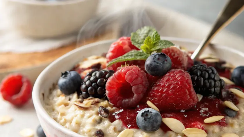 Servi gli overnight oats in ciotole semplici o in barattoli trasparenti, così da lasciare in vista il gioco di colori tra la panna morbida dei fiocchi e il rosso-viola acceso dei frutti di bosco. Accomodati a un tavolo vicino a una finestra, con una tazza di tè leggero o caffè dal sapore delicato, e lasciati coccolare da un momento di quieta energia. In accompagnamento, qualche mandorla spezzata o una foglia di menta fresca può aggiungere quel tocco di naturalezza in più.