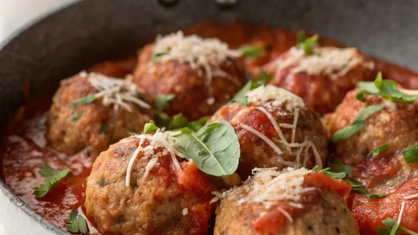 Servi le polpette in un piatto fondo, versando la salsa di pomodoro calda e fumante intorno. Un rametto di rosmarino fresco sopra aggiunge un tocco di verde e profumo. Adagia accanto una fettina di pane rustico leggermente tostato per raccogliere la salsa con dolcezza. La ricchezza dei colori – il rosso brillante del pomodoro, il beige della carne, il verde profumato degli aromi – crea un’atmosfera semplice e accogliente, perfetta per una cena senza fronzoli che scalda senza appesantire.