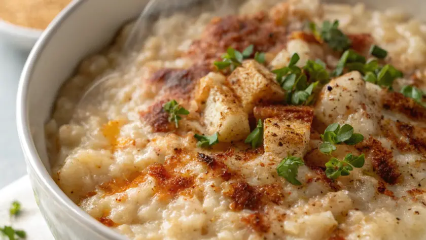 Il porridge va servito in ciotole rustiche, preferibilmente chiare, per far risaltare il caldo color miele del composto e i piccoli pezzetti di mela. Una spolverata finale di cannella o qualche scaglia di mandorle aggiunge dettaglio visivo e un tocco di croccantezza. È perfetto in un contesto semplice, magari accompagnato da una tazza di tè verde o un caffè dal sapore morbido. Il contrasto tra il dolce delicato del porridge e la freschezza della frutta rende l’atmosfera intima, quasi silenziosa, di una colazione lenta, dedicata a prendersi cura di sé.