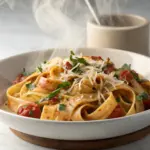 Porta in tavola la pasta su piatti fondi dal colore neutro per far risaltare il rosso vivido del sugo e il verde brillante del prezzemolo fresco. Accompagna il piatto con un calice di vino bianco leggero o acqua frizzante, lasciando che l’atmosfera resti semplice e rilassata. Se vuoi, un’insalata mista condita con olio e limone si sposa bene con la freschezza di questo piatto, aggiungendo un tocco di leggerezza al pasto.