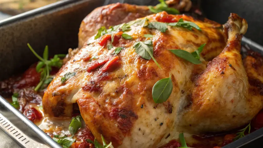 Servi il pollo ben caldo, magari accompagnato da una semplice insalata fresca di stagione o da un contorno di patate arrosto. Le fettine di limone restano a decorare la teglia, regalando un accento giallo vibrante che risalta sul colore dorato della carne. Il loro aroma aggiunge una freschezza che non appesantisce, creando un equilibrio leggero. Pochi dettagli al centro del piatto parlano di un pasto rilassato, quello che si gode senza fretta dopo una giornata intensa.