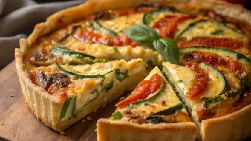 Serve questa torta appena tiepida, con colori caldi e una consistenza che invita a farsi un’altra fetta. Puoi accompagnarla con una semplice insalata verde o qualche fetta di pomodoro fresco, così da bilanciare le note morbide con qualcosa di croccante e succoso. Il suo aspetto rustico con le verdure visibili regala un senso di genuinità che sta bene con una cena tranquilla in famiglia o con gli amici, senza troppe pretese. Mettila su un piatto semplice, è il comfort in cucina che parla da solo.