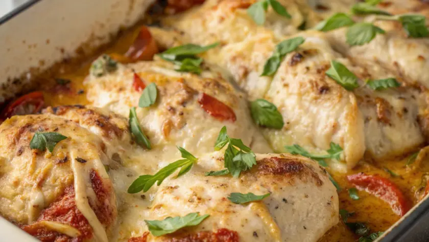 Porta in tavola il pollo caldo e cremoso direttamente nella teglia o disponilo su un piatto ampio, lasciando intravedere la sfumatura dorata del formaggio. Un leggero rametto di rosmarino fresco al centro aggiunge un tocco di verde e profumo. L’ideale è abbinarlo a verdure semplici, come bietole saltate o piselli freschi, che regalano contrasto nelle forme e nei sapori. Una croccante fetta di pane casereccio, appena sfornata, chiude elegantemente il pasto.