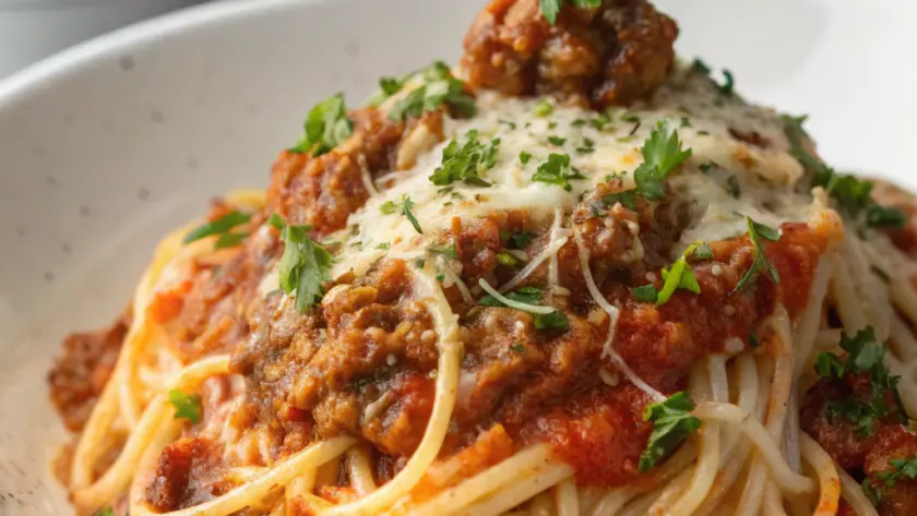 Servi gli spaghetti alla bolognese su piatti caldi, così il sugo rimane morbido e avvolgente fin dal primo assaggio. Il colore rosso intenso, arricchito dalla cremosità chiara della panna, crea un contrasto semplice ma invitante. Aggiungi una spolverata generosa di Parmigiano e, se ti va, qualche fogliolina di basilico fresco per un tocco di verde. Questo piatto crea un’atmosfera informale ma intima, perfetta per una cena in famiglia o con amici, senza complicazioni ma con tutto il calore di casa.