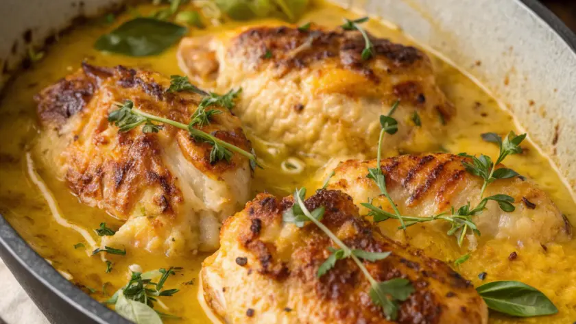 Porta in tavola il pollo alla senape caldo, magari accompagnato da un contorno di patate al forno dorate o da un’insalata fresca e croccante. I colori dorati della carne e la crema gialla tendente al panna creano un contrasto delicato sul piatto, ideale per un pranzo in famiglia senza fronzoli. Questo piatto invita a momenti tranquilli, seduti intorno a una tavola semplice, dove ogni boccone racconta il calore della casa.