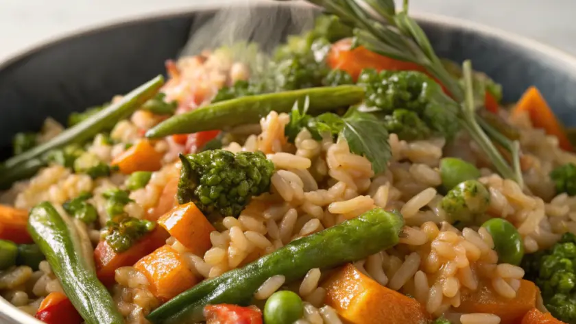 Il riso integrale con verdure al vapore è perfetto servito in ciotole di ceramica grezza, mettendo in risalto i toni naturali del piatto. Il contrasto tra il verde tenue delle zucchine e l’arancione vivo delle carote rende il tutto visivamente invitante. Per un pranzo leggero, può accompagnare una fettina di pane rustico tostato; la sua semplicità ben si sposa con una tisana calda o un bicchiere d’acqua fresca aromatizzata al limone. Sedersi con calma a tavola, lasciando che i sapori parlino al ritmo delle chiacchiere o del silenzio, dà a questo piatto una vita ancora più preziosa.