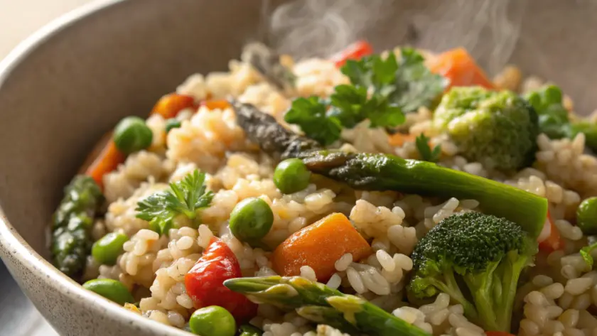 Il piatto trova il suo valore nella semplicità e nei colori naturali: il marroncino del riso integrale si sposa al verde brillante delle verdure, con qualche tocco arancione delle carote che accende il tutto. Servilo in ciotole rustiche, magari accompagnato da un filo d’olio a crudo sopra e una fetta di limone per chi preferisce un’acidità lieve. È un piatto perfetto per un pasto leggero, da gustare con calma, magari davanti a una finestra aperta o in compagnia di un libro. Il sapore delicato lascia spazio a un buon vino bianco leggero o a una tisana aromatica nel dopo pasto.