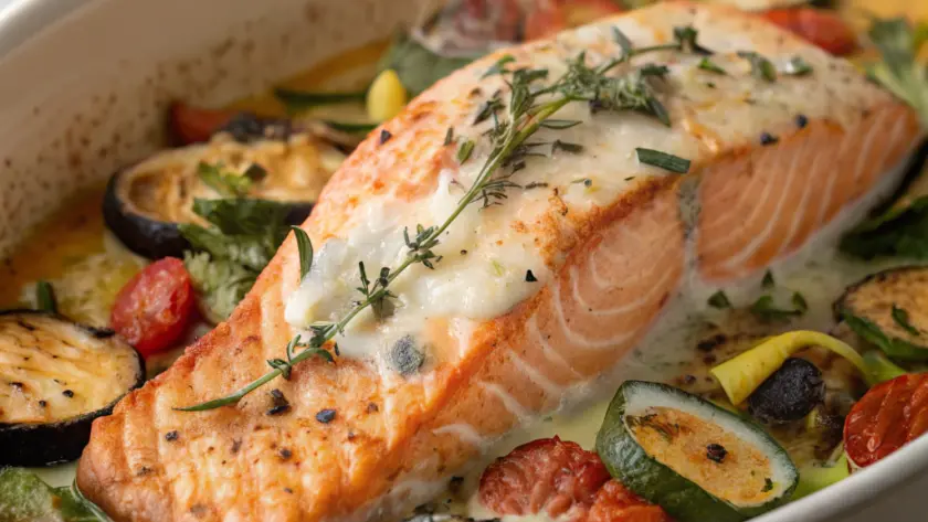 Servi il salmone direttamente nella teglia o, se vuoi, su un piatto ampio che faccia risaltare i colori vivaci delle verdure. Il contrasto tra l’aroma caldo e il tocco fresco del limone crea un equilibrio semplice e armonioso. Questo piatto si sposa bene con un bicchiere di vino bianco leggero o con un’acqua aromatizzata al cetriolo e menta per restare in equilibrio con la leggerezza del pasto.