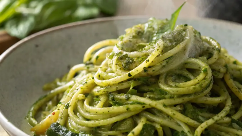 - Versare il pesto sulle zucchine e mescolare delicatamente, evitando di schiacciare gli spaghetti per mantenere la loro consistenza croccante.