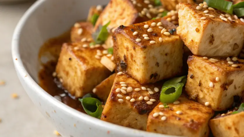 Servi il tofu croccante appena uscito dalla padella, ancora caldo e vibrante di profumi. È perfetto accanto a una fresca insalata di verdure croccanti o sopra un letto di riso jasmine profumato. I colori caldi della crosta dorata e i semi di sesamo sparsi donano un tocco rustico e accogliente, ideale per un pasto semplice ma curato. L’aggiunta di qualche foglia verde fresca, come il coriandolo o il basilico, completa il piatto con un dettaglio di leggerezza e colore.