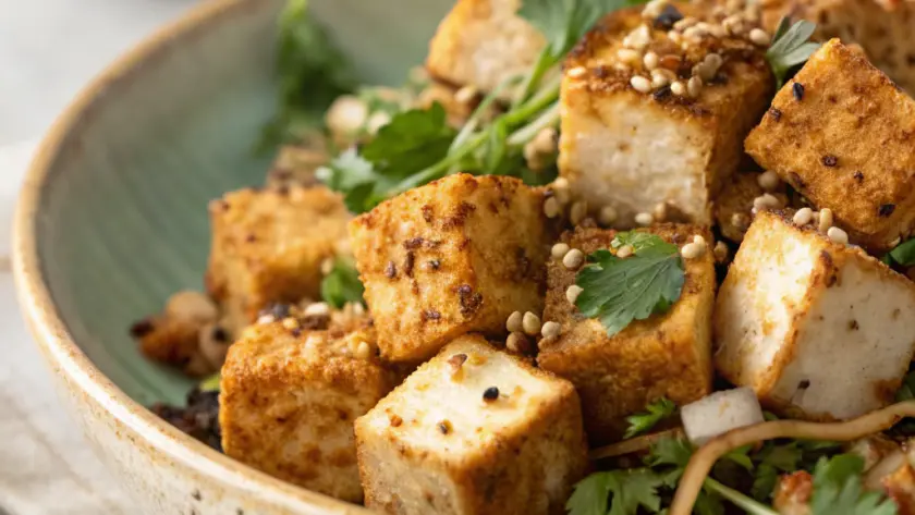 Questo tofu croccante si presta a essere servito su un letto di verdure saltate o direttamente accanto a una porzione di riso jasmine soffice. Il contrasto tra il colore dorato del tofu e il verde brillante delle verdure crea un bell’effetto visivo delicato. Puoi completare con qualche foglia di coriandolo fresco o una spruzzata di succo di lime per un tocco di freschezza. L’atmosfera che si crea è semplice, invitante e senza pretese, perfetta per un pranzo leggero o una cena informale.