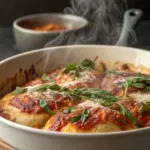 Versa la pasta nei piatti caldi per mantenere il calore più a lungo. Le foglie di basilico fresco in cima regalano un tocco di verde vivo che contrasta con il rosso morbido della salsa cremosa. Accompagna il piatto con un pane casereccio appena scaldata, da spezzare con le mani, e una bottiglia di vino leggero, come un rosato o un bianco morbido, per un equilibrio semplice e genuino.
