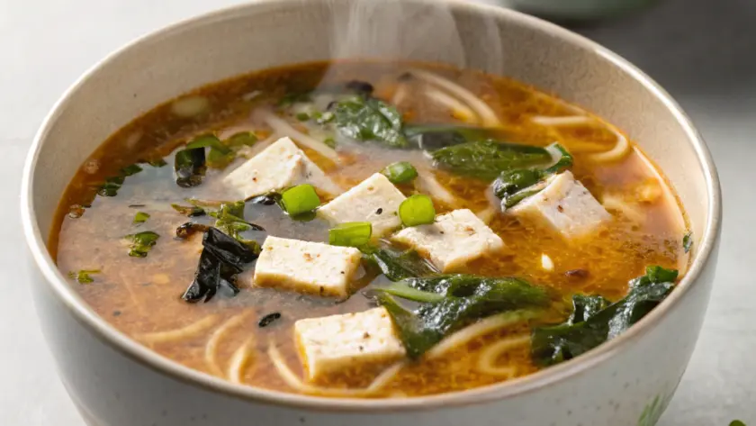 Servi la zuppa in ciotole rustiche, lasciando intravedere i piccoli cubetti di tofu e il verde brillante dei cipollotti. Il contrasto delle sfumature chiare e delicate del brodo con il tocco vivo delle alghe rende il piatto semplice ma accogliente. Accompagna con una porzione di riso al vapore o con qualche verdura saltata leggermente, per un pasto che parla di calma e di conforto. La sua delicatezza invita a un momento di pausa, seduti a tavola senza fretta.